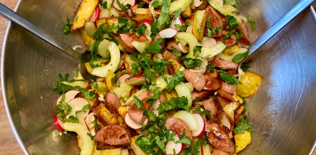Knuspriger Kartoffelsalat mit Wurst
